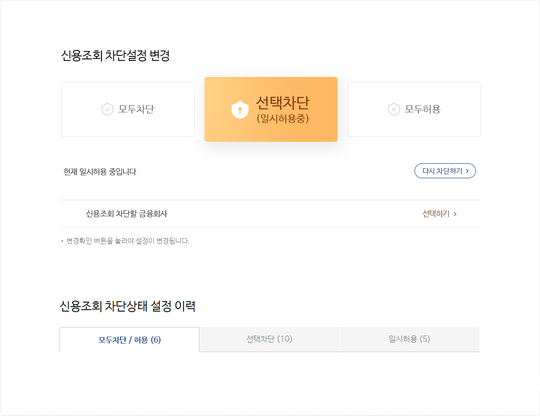 - 차단 설정 시 본인 동의 하에서만 금융사에서 내 신용조회 가능